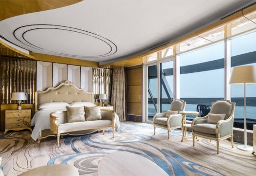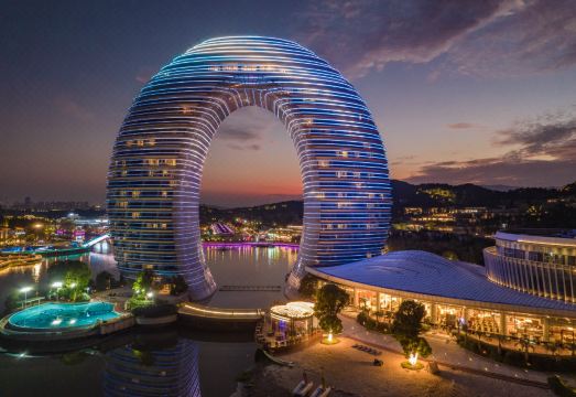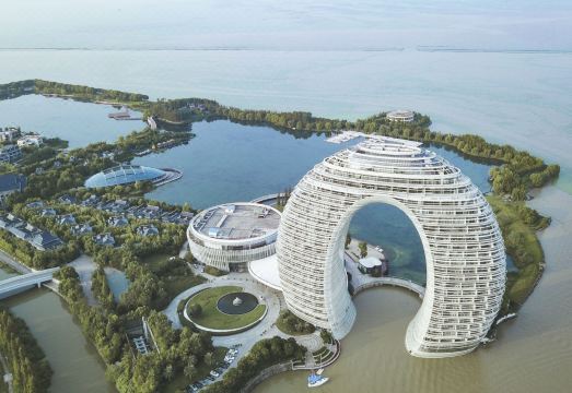 湖州喜来登温泉度假酒店坐落于浙江省湖州市风景宜人的南太湖之滨,晚上在外墙灯光的装扮下 “指环”型建筑变幻出五彩斑斓的绚丽图案,水中的倒影犹如一轮被涂上了色彩的弯月。湖州喜来登温泉度假酒店的室内装饰尽显高端奢华,大堂的阿富汗白玉、巴西虎眼石、黄水晶可称为是“集世界玉石之大成”。大堂天顶悬挂的2万串施华洛世奇水晶灯,远远望去犹如浪花一般晶莹剔透。